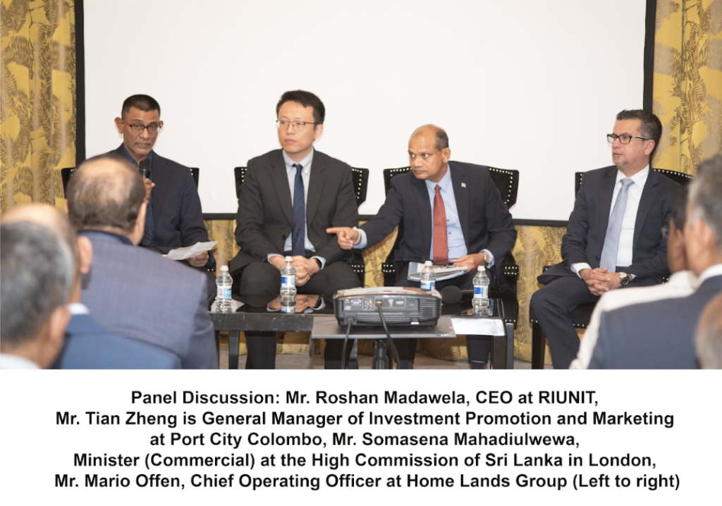 During the panel discussion, the Moderator and CEO of RIUNIT, Roshan Madawela, spoke of the impact of the peace dividend on the island nation which effectively kick-started the organised real estate sector from 2010 onwards. He stressed on the need to continue to build bridges and engage with all members of the diaspora communities. Mario Offen, COO at Home Lands Group, updated those present on the performance of apartments as an investment asset and how this sector has benefited from the growth in tourism while Tian Zheng, General Manager of Investment Promotion & Marketing at CHEC Port City Colombo spoke of how this project will propel the next generation of Colombo’s real estate, making it a world class