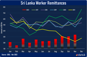 December 10, 2022 (LBO) – Sri Lanka foreign remittances are moving closer to a US$5bn annualized rate based on November monthly data. Sri Lanka remittances for the month of November totaled US4mn, up about 10% from the prior months figure. Before the economic crisis in Sri Lanka, the country used to receive over US$7bn per […]